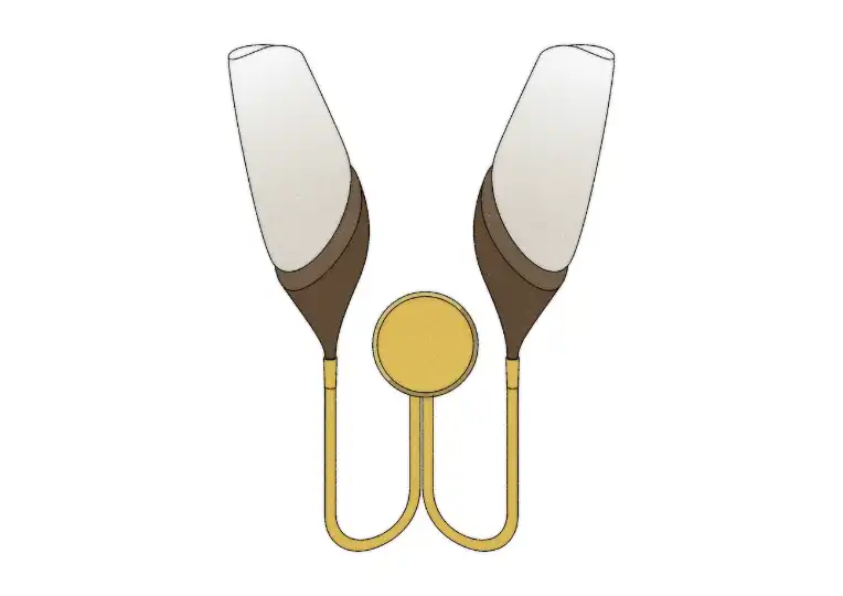 This double-sconce lamp by Joe Armitage is part of a collection commissioned by Milan’s design doyenne Nina Yashar for Nilufar Gallery. Showcased during Milan Design Week, the wall lamp is made from walnut and brass with recycled plastic shades.