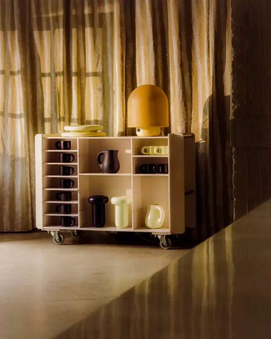 Now firmly established in the industry, Toogood is regularly tapped by manufacturers looking to work with modern designers. When we meet, she has just returned from Nagoya, where she spent a week hand-painting pots with roses for Japanese ceramics company Noritake. The resulting collection of limited-edition pieces, called Rose, will be shown at Milan Design Week this year, with scaled-up production of the pieces slated for 2026. Toogood is also returning to Milan this April to launch her second line of furniture with Brianza-based manufacturer Tacchini, after the success of her Cosmic collection of a sofa, shelves, mirrors and pendant lights, unveiled at last year’s fair. Titled Bread and Butter, the new collaboration revolves around a modular sofa rendered in a soft, light yellow leather. “I like looking to food for inspiration; it’s a smack of reality,” she says. “It’s about rejoicing in the everyday, in the food I grew up with, in the food I give to my children.”