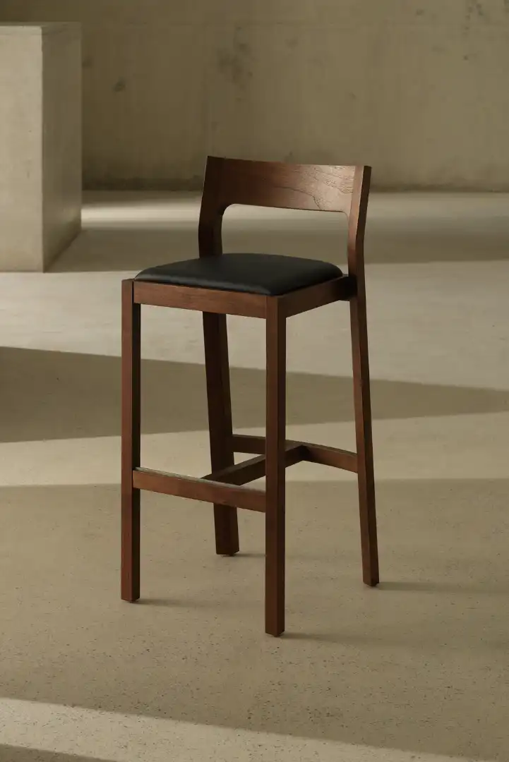 Made from solid wood, this stool has a soft upholstered leather seat and a recessed back for comfort.