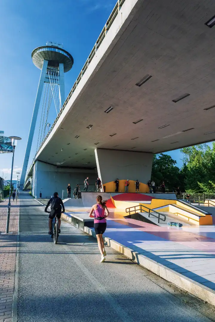 When architect Matúš Vallo was elected as mayor of Bratislava in 2018, he had a “blueprint” for the city that outlined which landmarks needed a revamp. On the list was the Most snp Bridge – or rather, its cavernous underbelly. A plan was hatched to turn the area crossing the Danube into an Olympic-quality skatepark and recreation area, with Czechia-based u/u Studio tasked with the pep up.