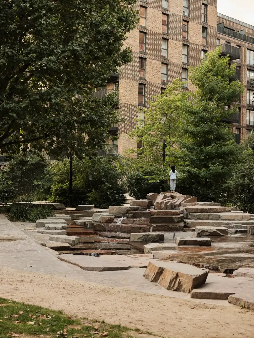 Highlights of the green space include verdant planting that abuts the adjacent cafés and a playground and water-play area that’s a hit with local children. The effect, despite the popularity of both, is instantly calming. “In the evenings, when the kids are gone, it’s soothing to hear the sounds of the water,” says Guzzon. Office workers can often be spotted dipping their bare feet into the water.