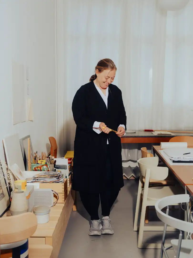 “I like to balance output and inspiration,” Manz tells Monocle in her studio in Sølvgade, Copenhagen. Sitting across an oak table that she designed for Fritz Hansen in 2009, she is cradling a cup ofhojichaand wearing a pair of pleated black trousers by Japanese designer Issey Miyake. Surrounding us are stacks of paper weighed down by stones, cardboard prototypes and tchotchkes that she brought back from her trips across the globe, all neatly displayed on shelves.