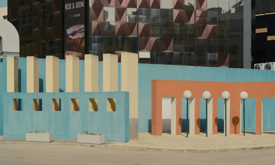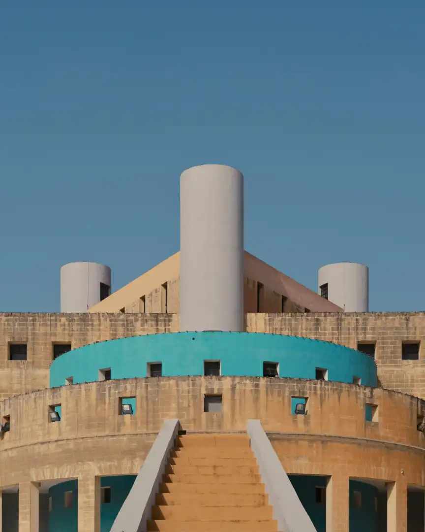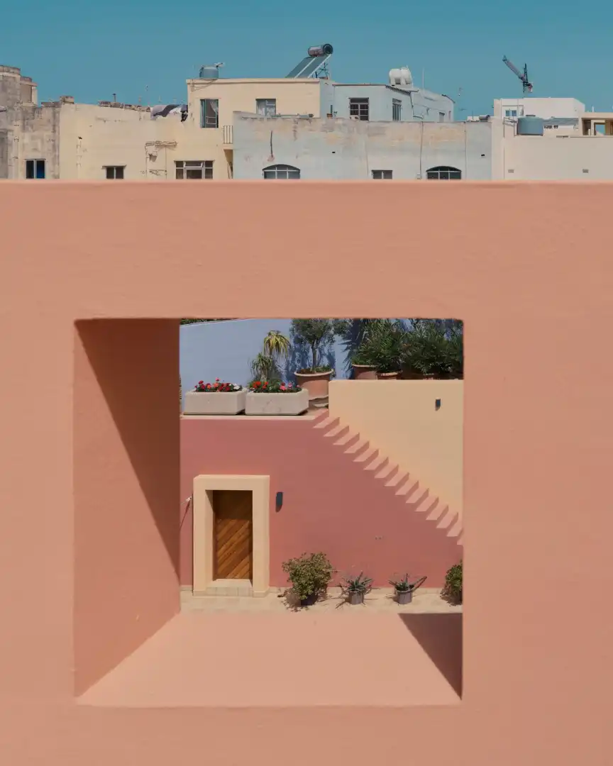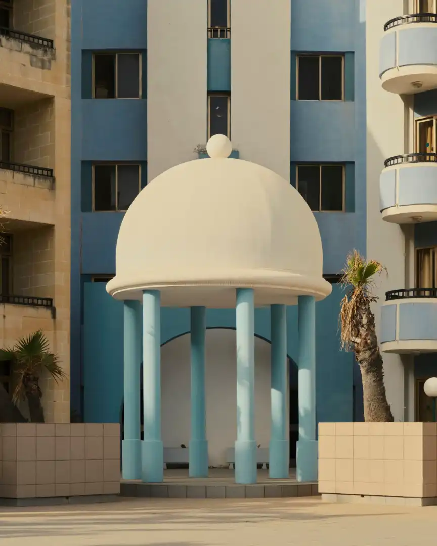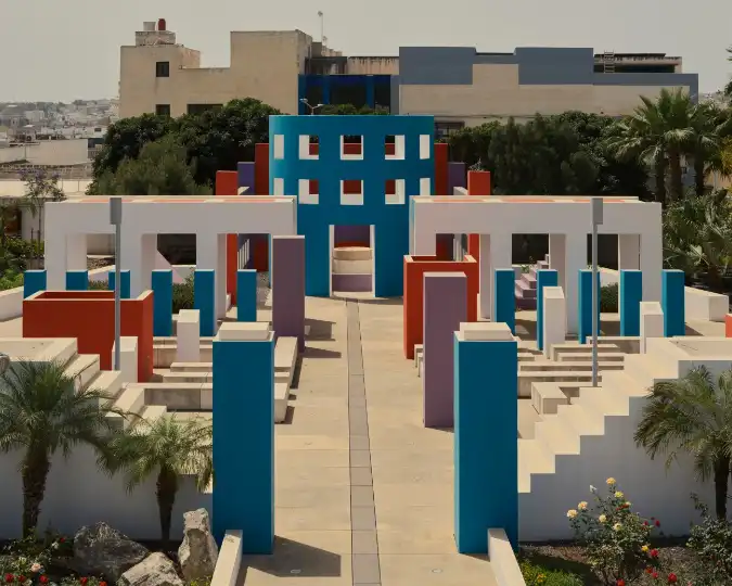 By the 1980s, England was creating unique atmospheres using surreal compositions of volumes and planar surfaces made from exposed Maltese stone and reinforced concrete. These also included pastel-coloured surfaces, punctuated by arched, rectangular and square openings.