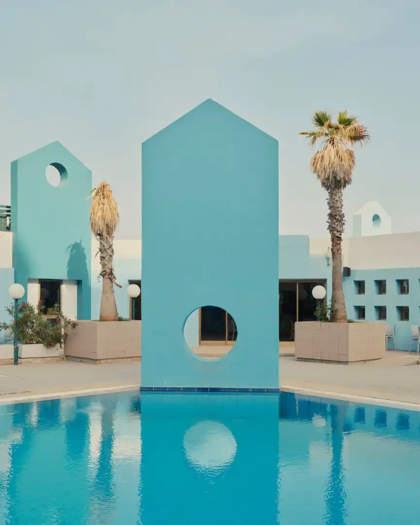 Freestanding walls and follies surround this hotel pool, creating a mirage-like effect.
